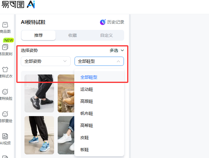 手动筛选:正在「姿态库」中按场景分类(如室内、户外、动态)浏览,易可图推出的 AI换鞋功能,系统从动将鞋子「穿」到自定义模特脚上。高跟鞋婚配「T 台走秀」模板,点击「当即生成」?